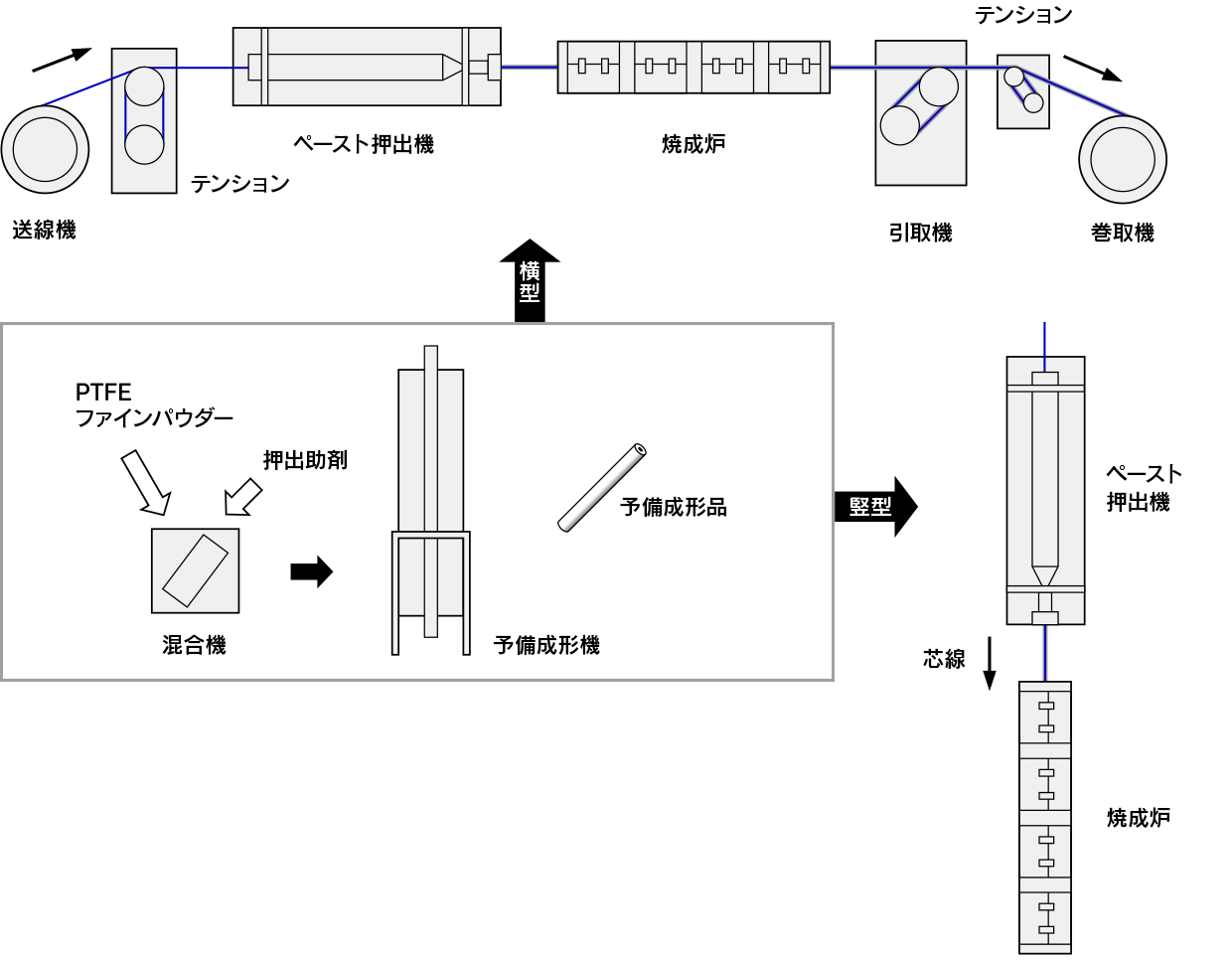 ペースト押出装置では、PTFEファインパウダーと押出助剤を混合し予備成形機で円筒状や円柱状に予備成形した後、押出機で所定の形状に押し出し、焼成炉で焼成します。